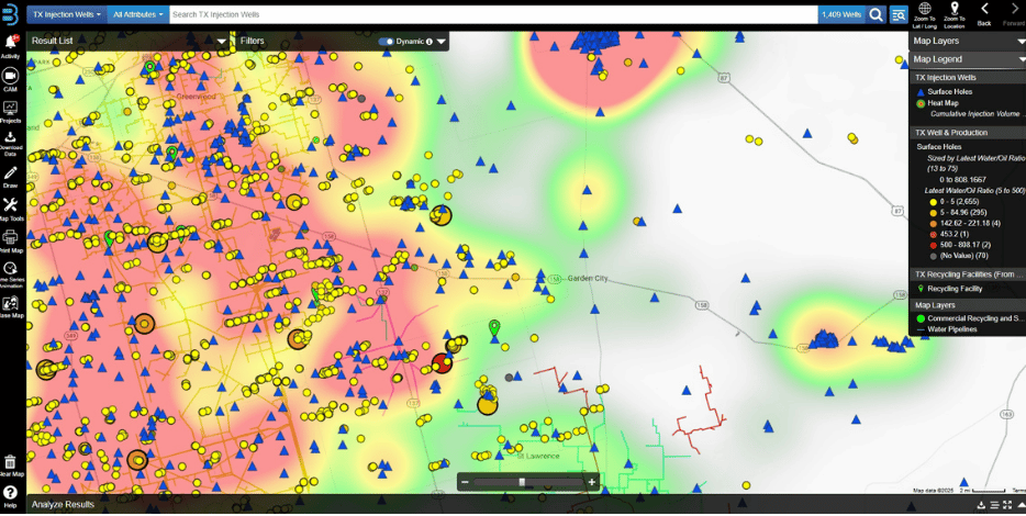 Texas production wells. By tracking how water ratios change over time, users can anticipate rising water cuts, understand evolving infrastructure needs, and ensure disposal and recycling capacity align with future production. The result is faster, better-supported permits and more efficient, data-driven operations.