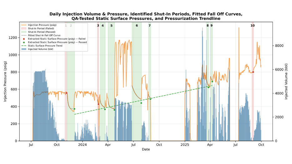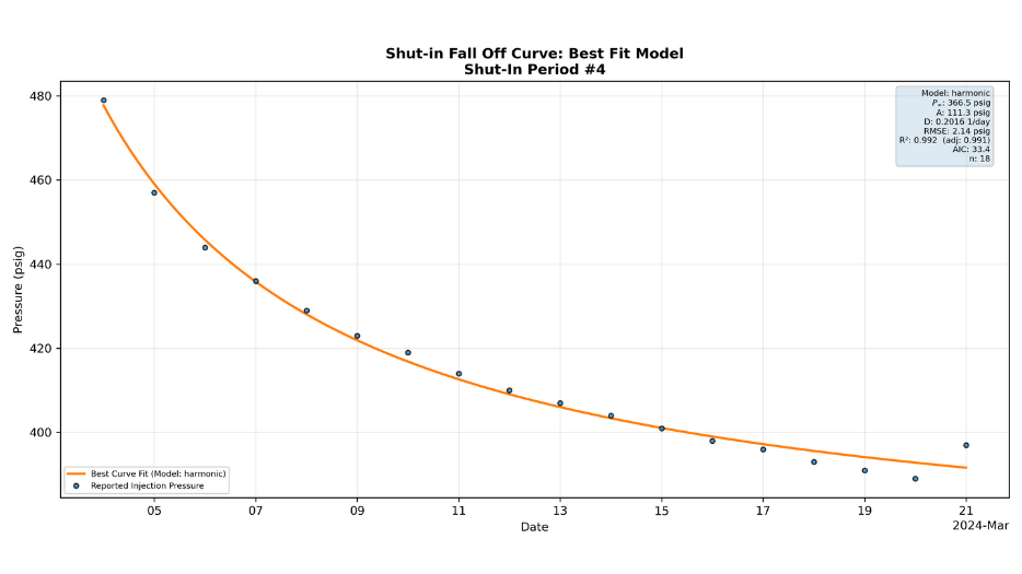 B3’s new, proprietary Shut-In Fall-Off analysis models how pressure declines during non-injection periods, estimating a formation’s natural equilibrium pressure—a key indicator of reservoir health and available capacity.